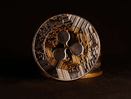 The back and front of the silver ripple coins on a black background. Conceptual image for worldwide cryptocurrency and digital payment system. Top view