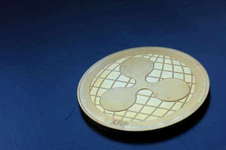 Ripple coin on blue background. Cryptocurrency concept. Selective focus.