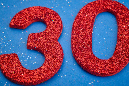 Number thirty red color over a blue background. Anniversary. Horizontal