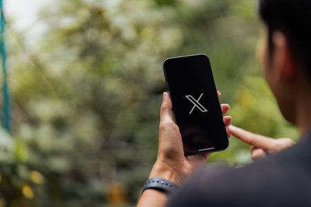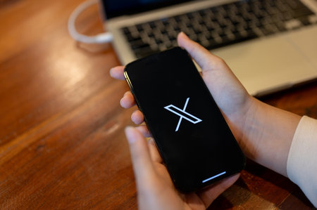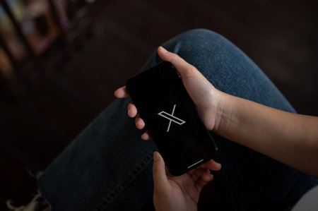 Chiang Mai, Thailand - Aug 14 2023: A female using X new twitter application on her iPhone14 while sitting in her office. close-up image of a new Twitter X application logo on iPhone14's screen.