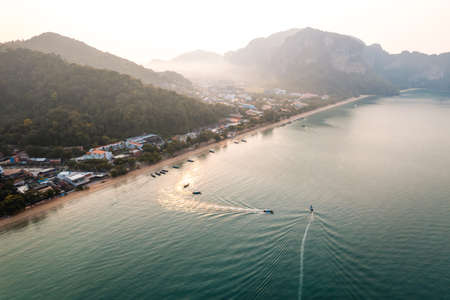 Blue clear water with boats. Green tropical island Phi Phi, palm trees grow. Shooting from a drone from the air. Beautiful seascape. Turquoise color of the water, you can see the bottom and corals.