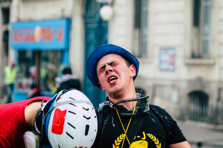Reims France May 18, 2019 View of French medic walking in the street during protests of the Yellow jackets against the policy of President Macron in Reims on saturday afternoon
