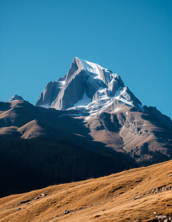 Majestic Snowy Mountain Peak Basks in Bright Sunlight, Offering Stunning Alpine Scenic Views