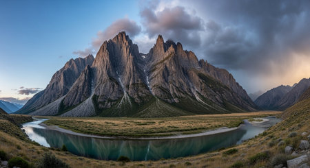 Mountain landscape with a river and snow-capped mountains at sunset