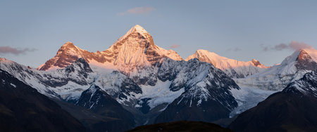 Fantastic panorama of snow-capped mountains at sunrise.