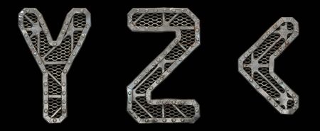 Mechanical alphabet made from rivet metal with gears on black background. Set of letters Y, Z and symbol left angle bracket. 3D rendering