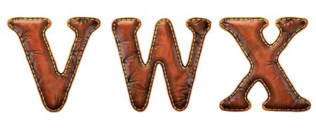 Set of leather letters V, W, X uppercase. 3D render font with skin texture isolated on white background. 3d rendering