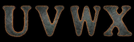 Set of leather letters U, V, W, X uppercase. 3D render font with skin texture isolated on black background. 3d rendering
