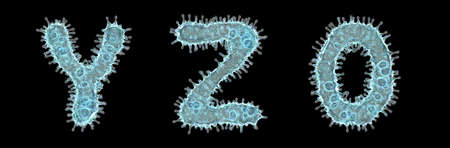 Set of letters made of virus isolated on black background. Capital letter Y, Z. and number 0 3d rendering. Covid font 3d