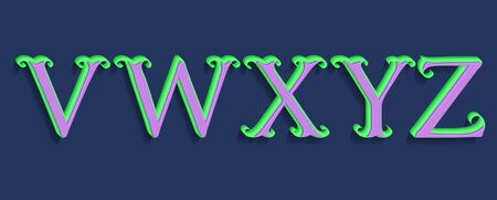 V, W, X, Y, Z green purple volumetric letters. Vintage 3d font.