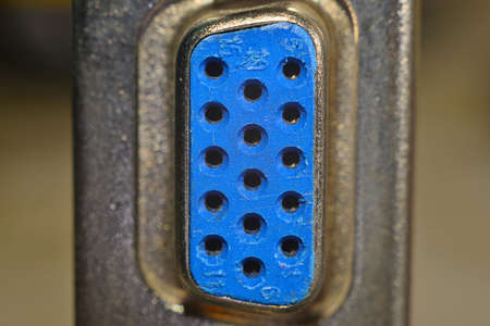 Simple laptop computer VGA video output connector, monitor connection port object macro, detail extreme closeup, frontal shot, nobody. Old legacy video outputs, obsolete dated retro technology concept