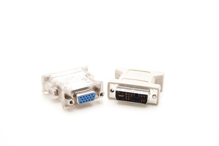 White adapter for connecting dvi-d and vga and blue monitor cord behind it. Connection of computer devices with plugs of different types. Close-up.