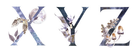 Part of the unique letters of the Latin alphabet - V, W, X, Y, Z in the form of frozen winter patterns isolated on a black background. Concept of the Christmas alphabet in frozen drawings.