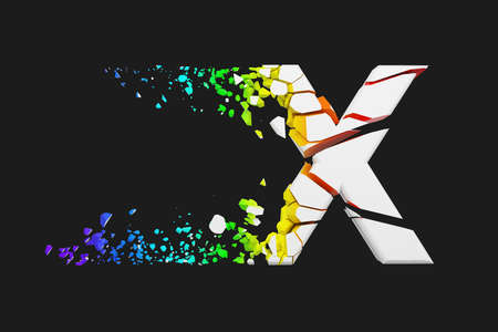 Broken shattered iridescent alphabet letter X uppercase. Crushed white and rainbow font. 3D render isolated on gray background. Typographic symbol from spectrum cracked debris.