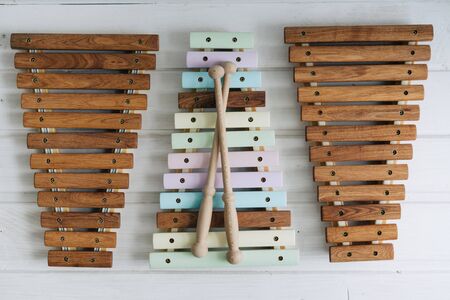 Colorful wooden instrument xylophone on a table. Children's toy for musical leisure. Popular kid musical instrument. Music and childhood concept. Home education.