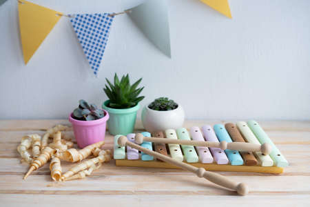 Xylophone is made of natural wood. Wooden sticks for musical instruments. Musical instrument made of natural wood without the use of plastic. Succulents in small pretty pots.