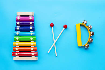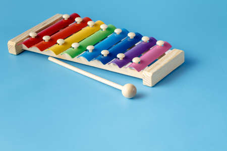 colorful educational xylophone toy on a blue background with copy space. Children's toy and musical instrument.