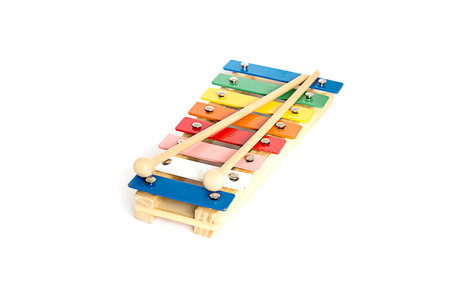 Xylophone toy with 12 colorful tunes made with metal and wood isolated on white background. Educational toy for preschool.