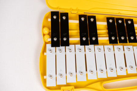 Close up color full glockenspiel xylophone on yellow background, musical concept