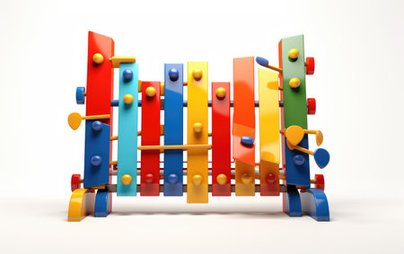 This 3D rendering presents a xylophone with a musical note against a light blue backdrop. The instrument features a range of colors and textures, suggesting a studio environment. The image is suitable for various commercial uses, including advertising and educational materials. The composition and lighting create a clean and appealing aesthetic.