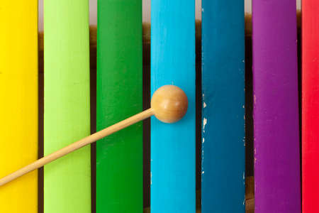 Rainbow coloured xylophone on wooden background angle view. metallophone with soft focus effect