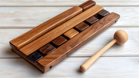 Wooden xylophone with a mallet rests on a white surface, ready to be played