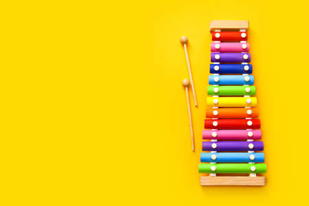 Multicolored wooden xylophone and shock sticks on bright yellow background flat lay top view copy space. Wooden children's musical toy Baby musical instrument Colors of rainbow. Kids natural eco toys.