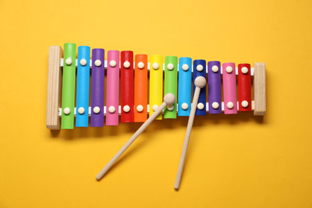 Colorful toy xylophone with mallets on yellow background, top view