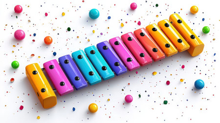 This vibrant xylophone is surrounded by colorful sprinkles and balls, creating a playful atmosphere perfect for educational themes, creativity, and music.