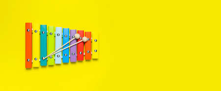 Rainbow colored toy xylophone with two sticks on yellow background. Copy space