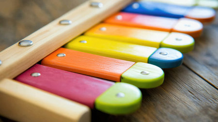 A vibrant xylophone rests on a wooden table inviting children to explore musical creativity with its bright colored bars.