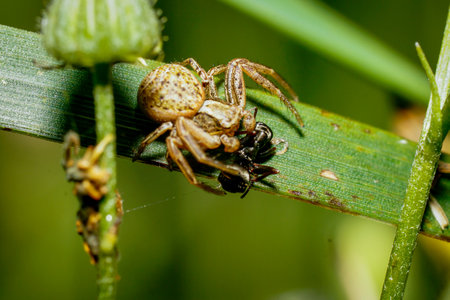 Close up of a xysticus sp. Crab spider with its prey on a blade of grass