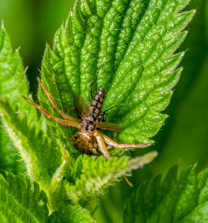 Crab spider with captured fly between nettle leaves
