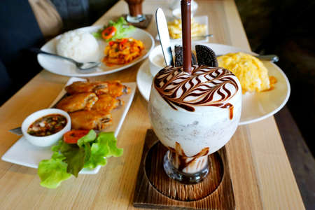 Chocalate smoothy wite chocolate chip and some snack on the table in cafe