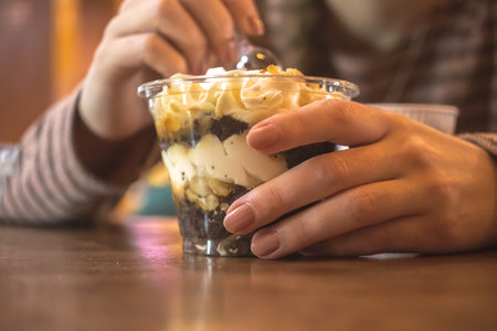 Woman with sweet dessert in her hands in cafe. Coffe break concept background