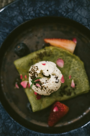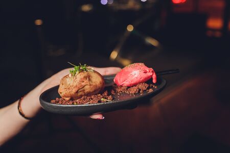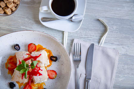 Close up view of beautiful elegant sweet dessert served on the plate. Beautiful decoration, restaurant dish, ready to eat. Tea time, cozy atmosphere.