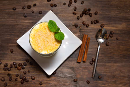 Dessert classic tiramisu view from above, garnished with mint leaves. On a dark wooden table. Space for text.