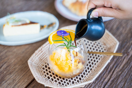 Pouring coffee on ice cream to make an affogato coffee on a garden table background.
