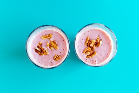 Natural dessert healthy cocktail in a wine glass with natural blueberries in a drink and with three strawberries below. Black background. Horizontal view. Close-up. Copy space. Top view.