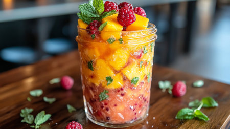 A vibrant fruit medley features fresh mangoes and raspberries in a glass jar, garnished with mint leaves. Perfect for summer gatherings and healthy snacks.