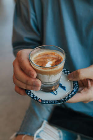 Man hands holding a cup of coffee, ripped jeans. Fashion manicure. Enjoying new day spending free time in Sunday morning at home, vertical.