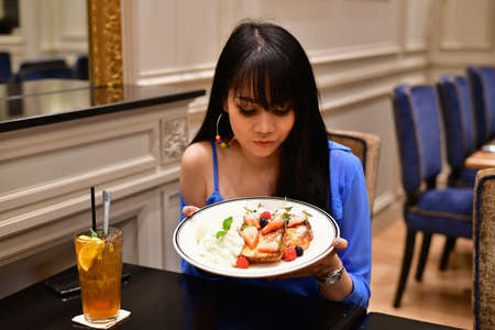 Restaurant Concept. Asian women eating in restaurant. Asian women are happy to eat. Asian women relax in a restaurant. In the restaurant, Asian women are smiling happily.
