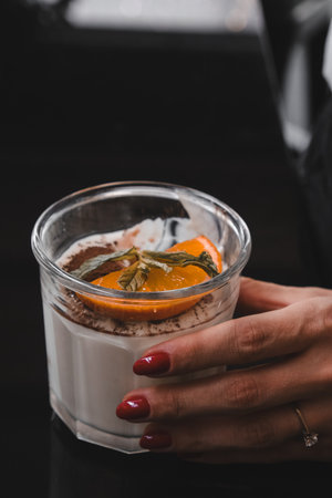 Customer eating sweet creamy orange dessert serving on square cut plate in restaurant. Delicious cake decorated by dried citrus, cherry and mint, close up picture