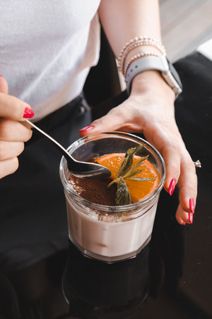 A mug of hot chocolate is placed on the table in the cafe, giving it a warm atmospher