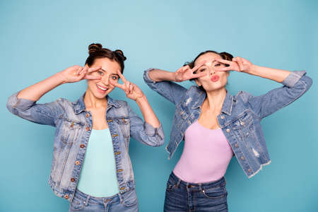 Portrait of attractive charming satisfied hipsters childish carefree isolated making v-signs coquettish flirting having casual vacation outside street wearing denim clothes on blue background