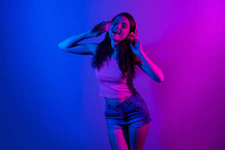 Photo of young funky beautiful smiling woman in headphones dancing isolated on glowing blue color background