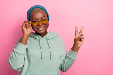 Portrait cute young cheerful lady in cool sunglass showing v sign meet her friend say hello isolated on pink color background
