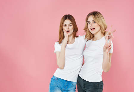 funny girlfriends in white t-shirts hugs emotions fun friendship