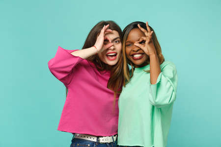 Two young women friends european and african american in pink green clothes showing OK gesture isolated on blue turquoise wall background studio portrait. People lifestyle concept. Mock up copy space