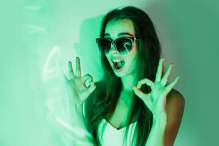 Night portrait of a young excited girl with reflection in sunglasses in green neon light, showing ok sign with both hands.